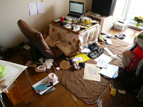 因為整理行李的途中東西就直接亂丟地上,導致現在我的房間裡連一條平坦的通道都沒有。